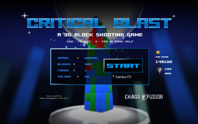 Critical Blast is a puzzle/action game with unique first-person controls. The objective is to shoot falling blocks before they stack up. See how many points you can score in this simple yet fun and fast-paced video game!
