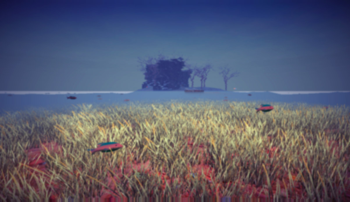 I used the fish textures from the previous experiment and created one large particle system that spawns fish under the water across the whole terrain. |
