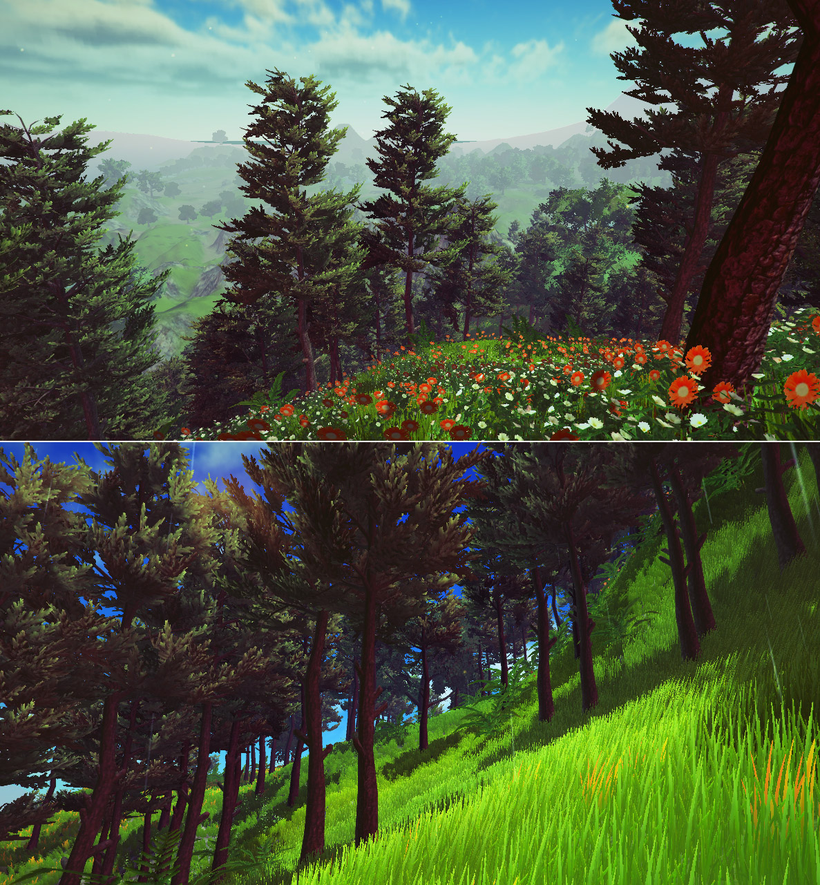 It's a great feeling when you walk along the side of a steep slope and look out between the trees and see everything in the distance. It's easy to add trees and bushes randomly, but a little harder to make rocks, trails, cliffs, etc, so I'll add more details like that when the terrain is closer to completion.
