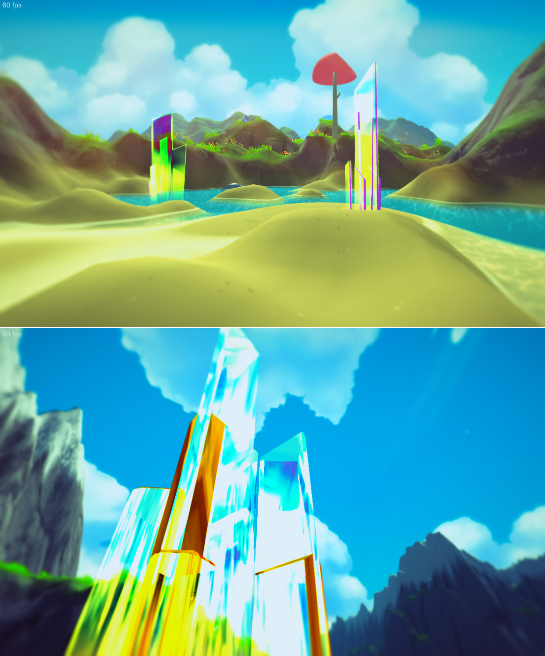 I noticed the skybox was "burning" into the screen, so I had to undo the recent changes. But, I added a nice fade effect at the base of the crystals and increased the refraction and color multiplier, so they now look more opaque and colorful.