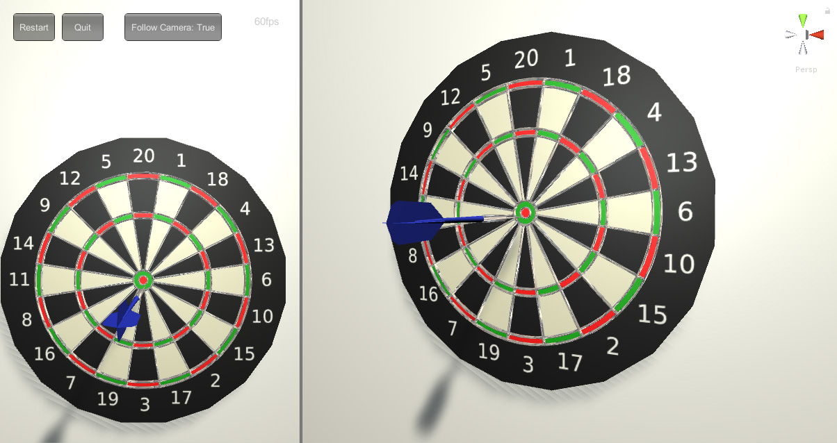 I built a quick demo in about 1-2 hours just to see if it would be possible. I modeled a dart, attached a rigidbody component, a mouse-look script to aim the dart, and a simple script to apply forces to it. Then I modeled a dartboard with all its separate faces for capturing collision events and scoring. It's not pin-point accurate, but I'm impressed it works so well. I need to test on mobile/android.