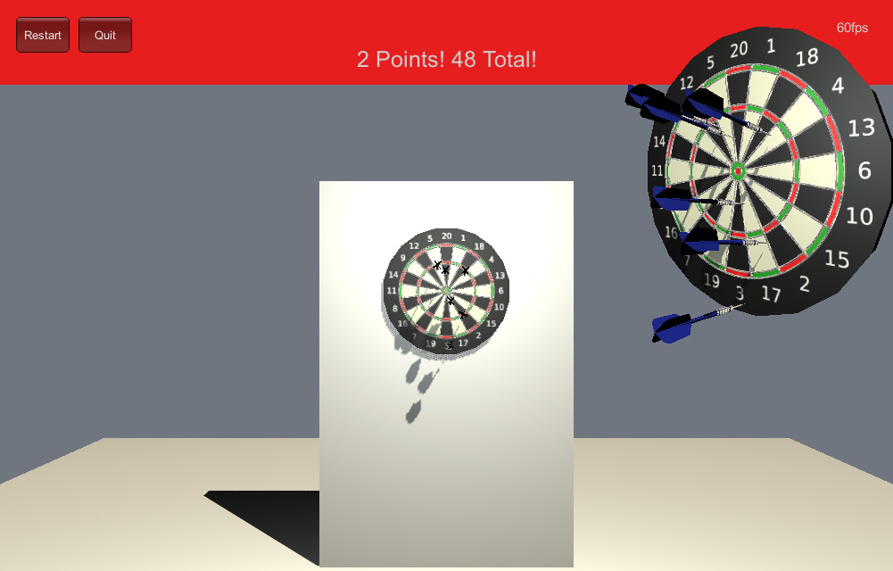I added spin and downward rotation to the darts so the motion looks more natural. I updated the models. I setup the script to generate darts for multiple throws/turns. I added a second camera which is ordered on top of the main camera, to get a nice close-up / angled view of the dartboard and dart scoring positions. The scoring is working too.