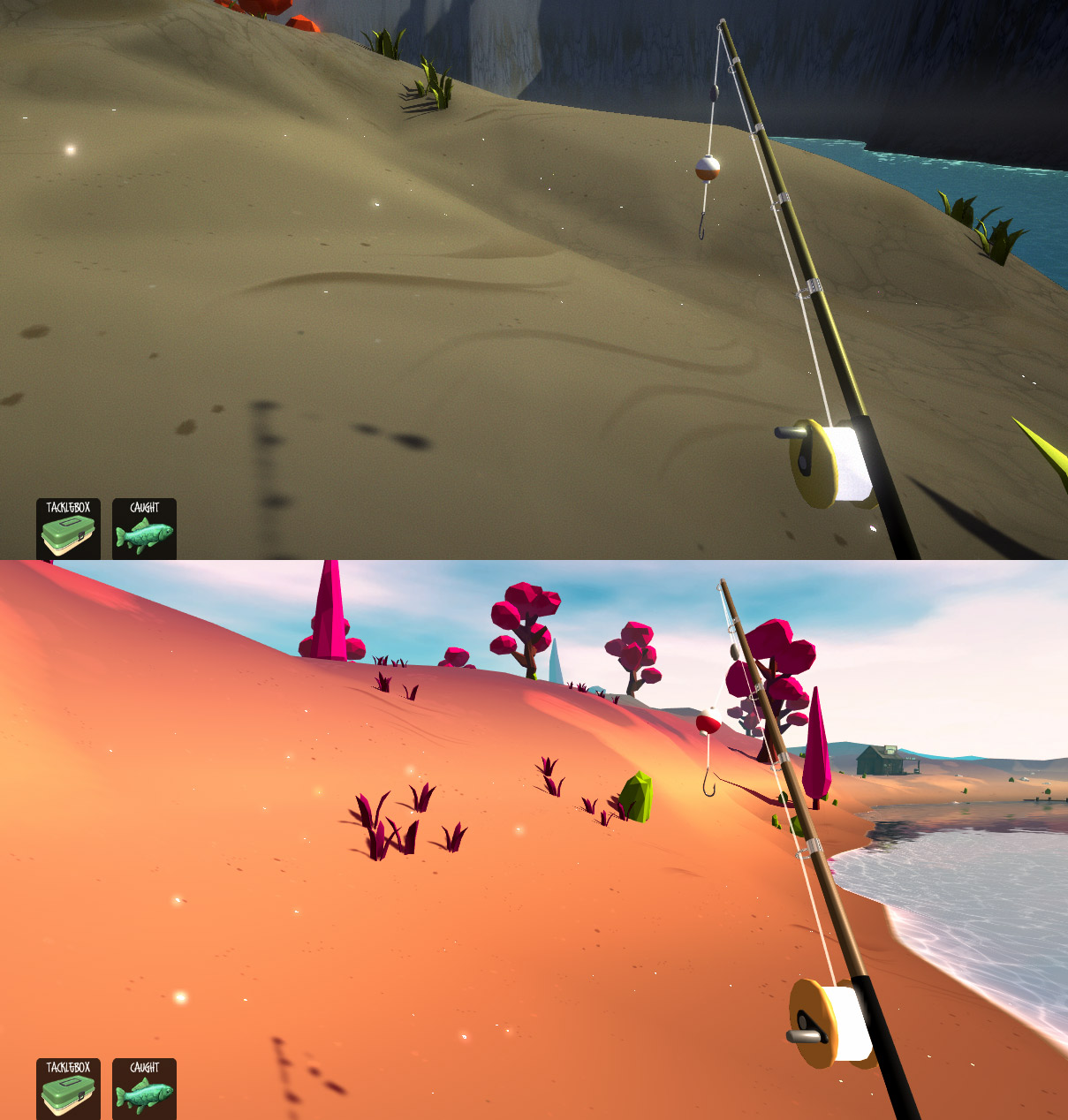 I adjusted the water settings so there's more refraction and bloom on the light from the sun. | |