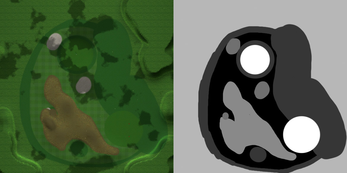 The creation of the first course was mostly improvised. I'm trying to plan the second course better, by starting with an overhead drawing, then I'll use that as a rough template for the course when I paint the textures and heights in Unity.
