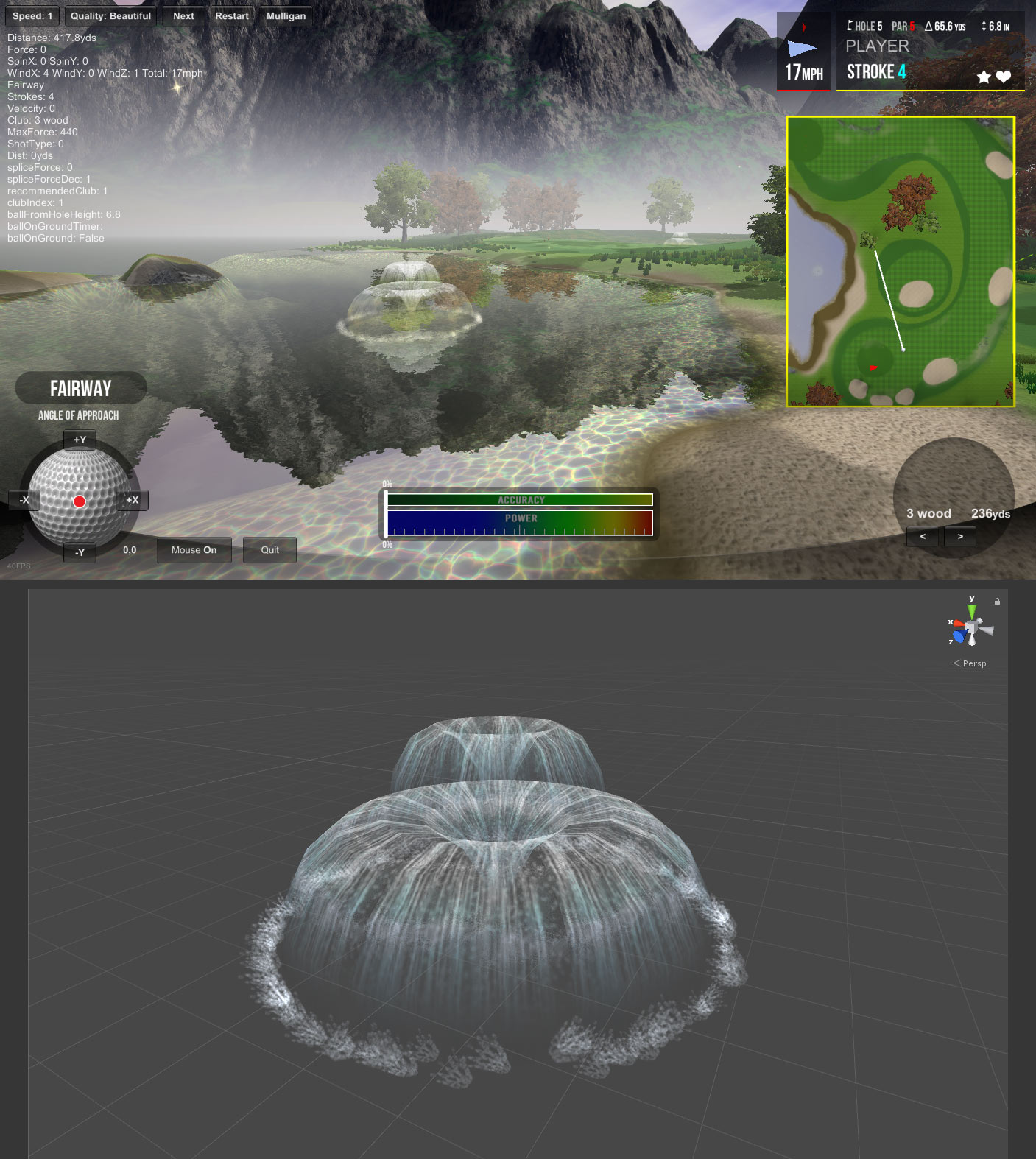 I tried a technique where the uv coordinates are mapped in an outward direction, then scrolled, to produce a simplistic water fountain effect. I don't think I mapped the uvs correctly, but it resulted in an interesting effect anyway, so I'm happy with it.