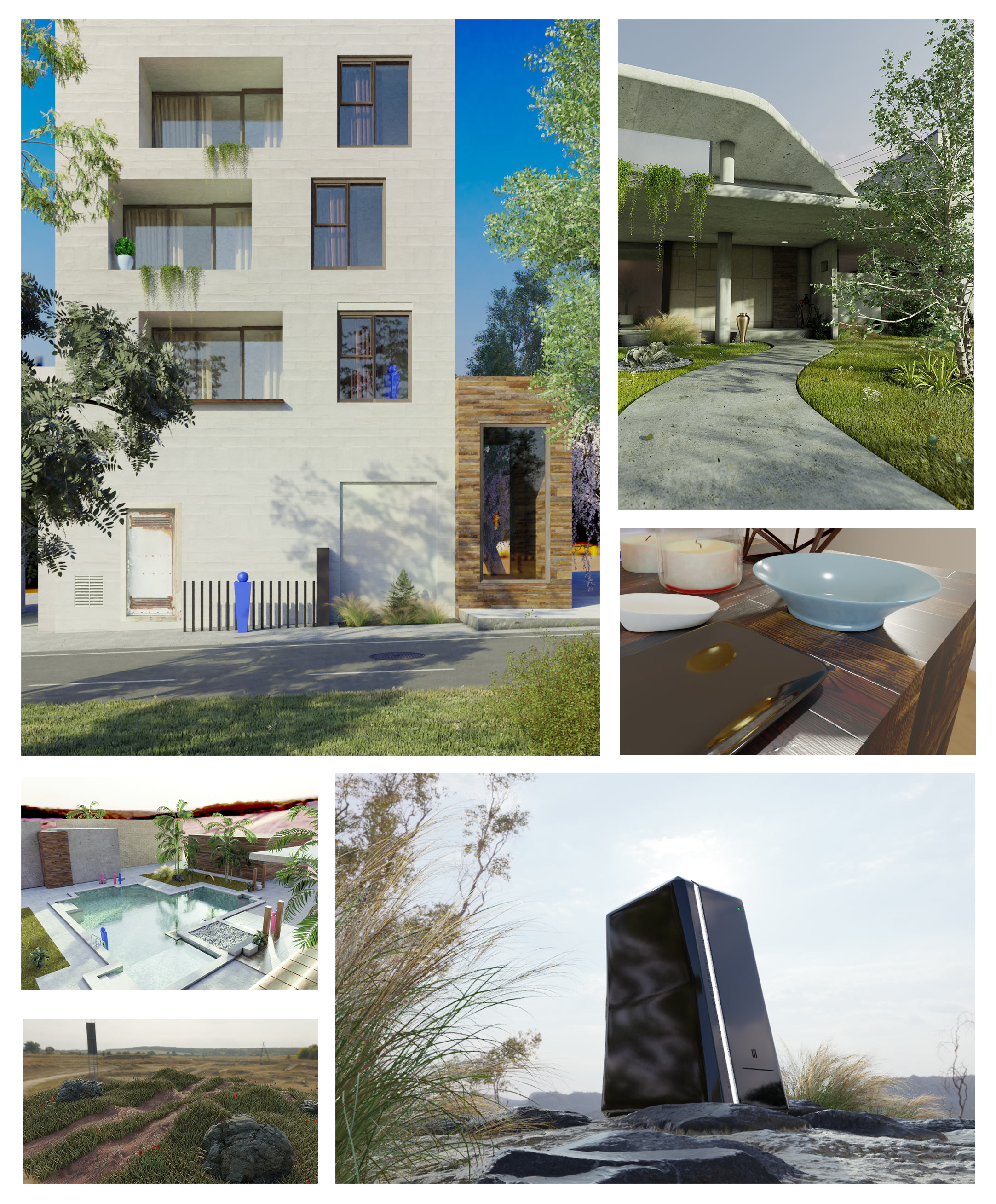 Here's a collage of recent projects. The first few images were inspired by 3d renderings by other artists and/or used for reference. I gave up on the pool scene because I couldn't get it to look realistic, but I managed to make some things look really good. I love the grass and lighting in several scenes.